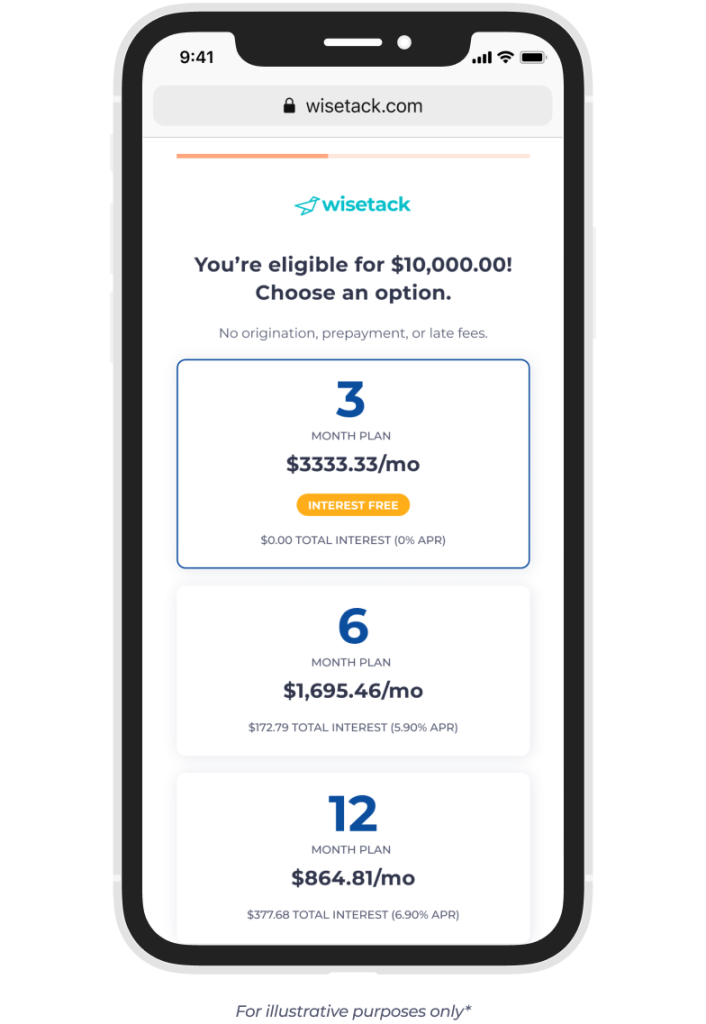 *All financing is subject to credit approval. Your terms may vary. Payment options through Wisetack are provided by our lending partners. For example, a $1,200 purchase could cost $104.89 a month for 12 months, based on an 8.9% APR, or $400 a month for 3 months, based on a 0% APR. Offers range from 0-35.9% APR based on creditworthiness. State interest rate caps may apply. No other financing charges or participation fees. See additional terms at https://wisetack.com/faqs.